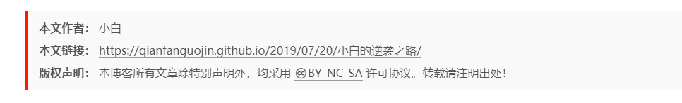 # If not defined, `author` from Hexo `_config.yml` will be used. copyright: 小白 #设置底部显示的名字,默认为站点配置文件的author名字