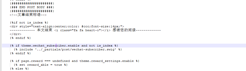 {#####################} {### END POST BODY ###} {#####################} <!--文章结束标语--> {%4if theme.post_end_text && not is_index%} {% include 'post-end-text.swig' %} {% endif %}